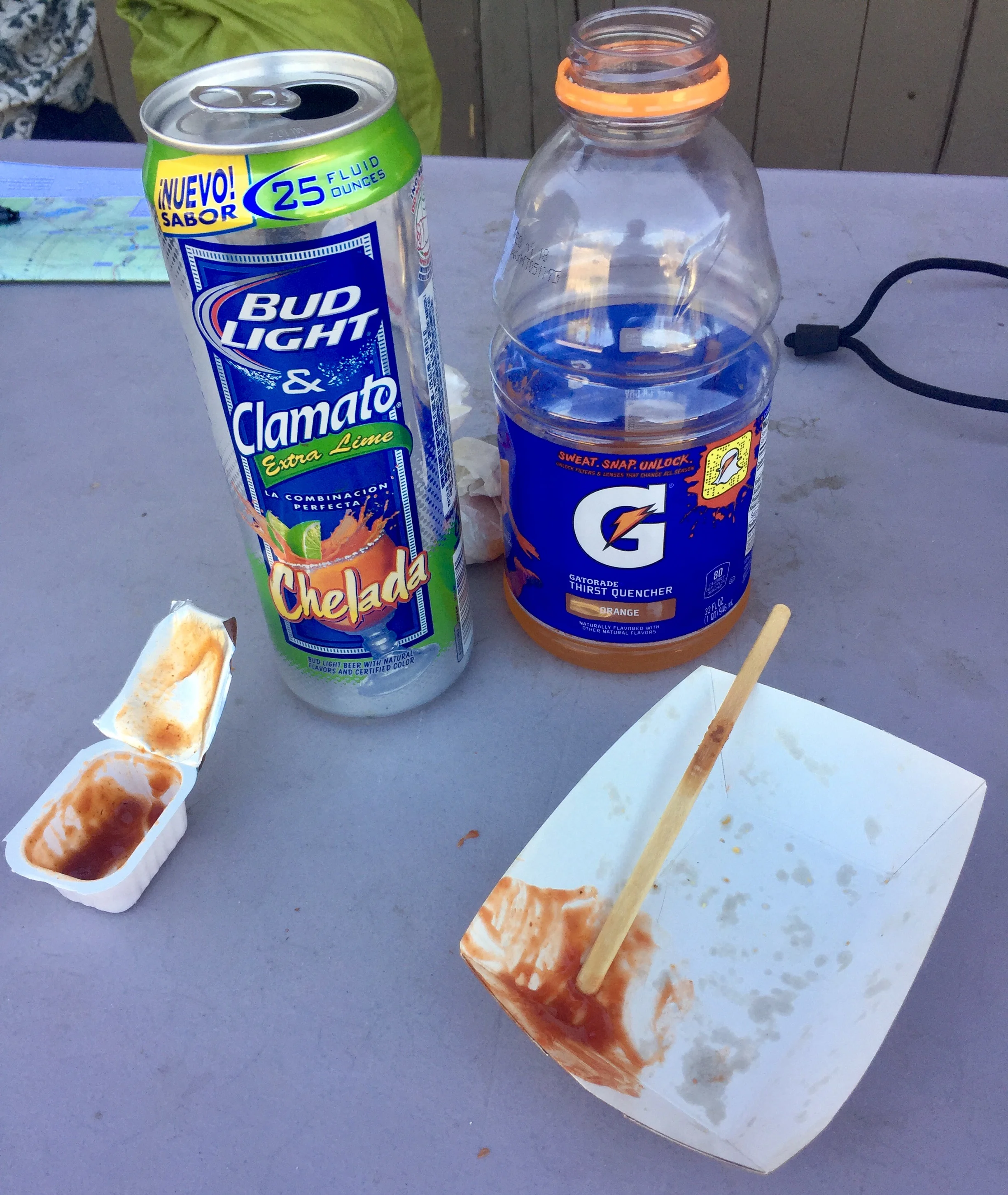Since Kracker Barrel was open until 7PM, I stayed there until 7PM. I made calls for the first time in four days, drank powerade, and ate every edible-looking item remaining in their hot-food case. The three courses of my meal, in order, were a corn dog, an order of tots, and a “crispito” which ended up being a chimichanga full of molten meat-cheese. It was everything that its name promised it would be. As I eat the crispito, two hikers emerge from the store and ask us if we’d like a 24oz can of Budweiser clamato. Apparently, they tried a couple sips and couldn’t handle it, probably because clamato is gross. My hiker impulse takes over, “sure, I’ll take it.” It’s warm, somehow warmer than the ambient air temperature. Orion and I pass it back and forth, grimacing with each sip. Orion mutters, charitably, “it’s probably alright when it’s cold.”