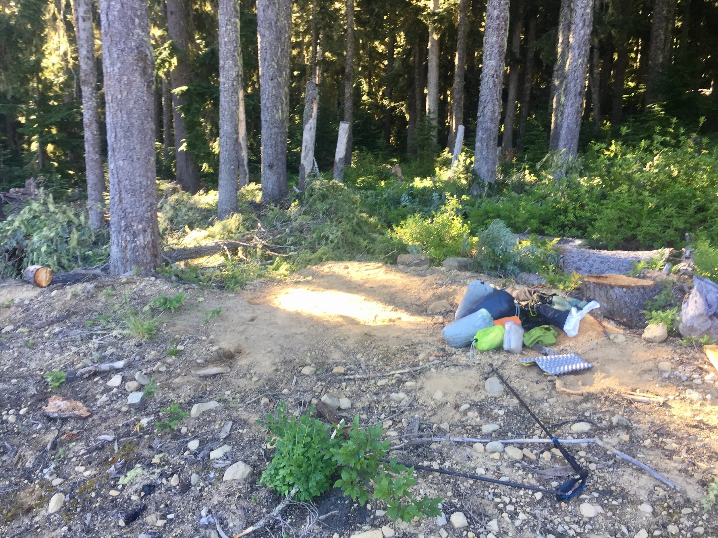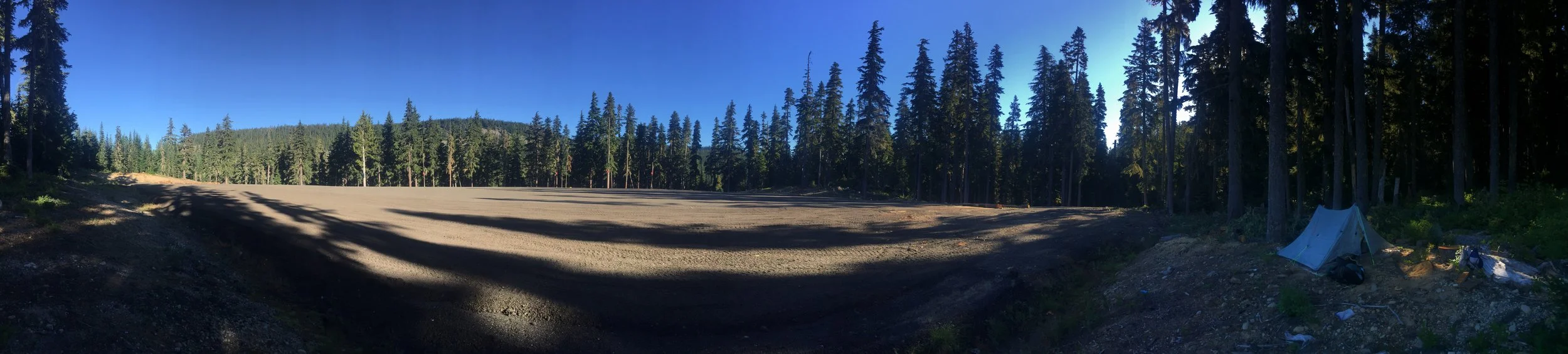 Eventually, I cross the highway and hop a gate to explore one of the White Pass ski resort parking lots. The lot is empty and set back from the road. I’d be out of site of the road, but the woods are rocky so there’s nowhere far off the parking lot where I can pitch a tent. I end up kicking clear an uneven, rocky, dusty tent-sized patch adjacent to the far end of the football-field sized lot and I pitch my tent. I send a panorama of my tent-site to Em and she responds, “you are so out in the open.” Yes, well, stealth campers can’t be choosers. At least I’ve got plenty of water and the crispito is sitting well. I fall asleep dreaming of tomorrow’s warm food, company, ample hydration, and indoor plumbing.