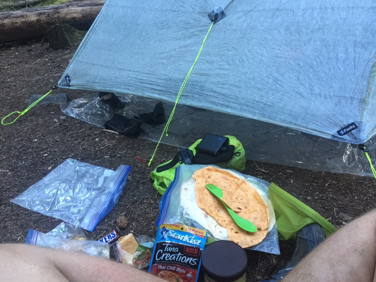 The campsite was empty. I expended every last ounce of energy I had to get here, so I'm camping alone tonight for the first time. I hung my food a ways away from camp. I still plan on wearing earplugs.