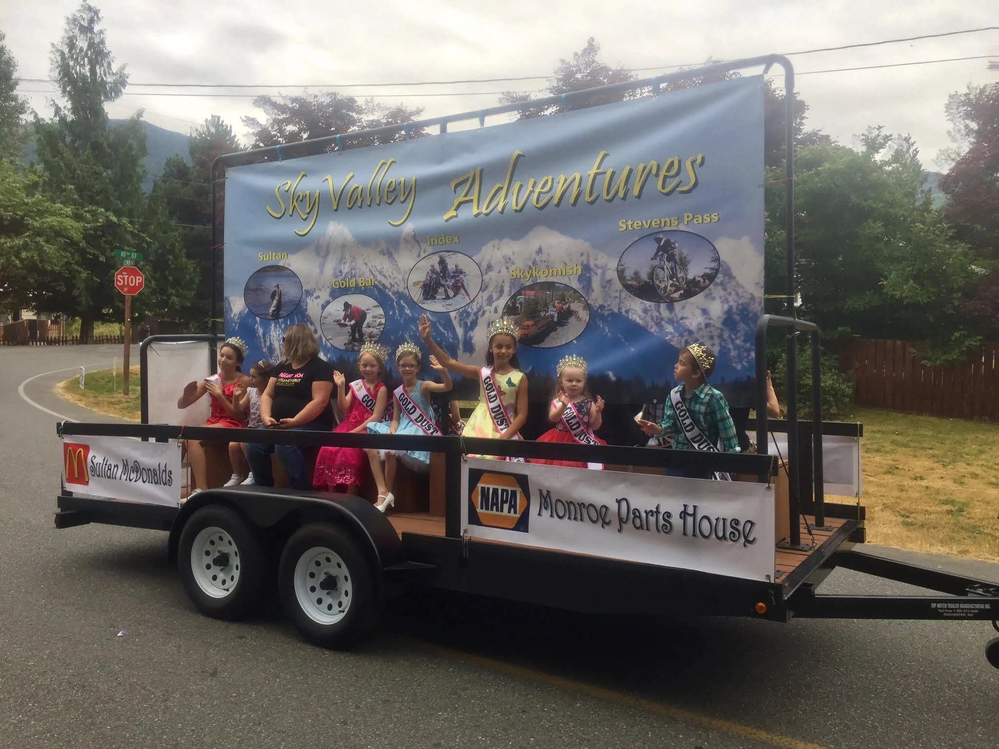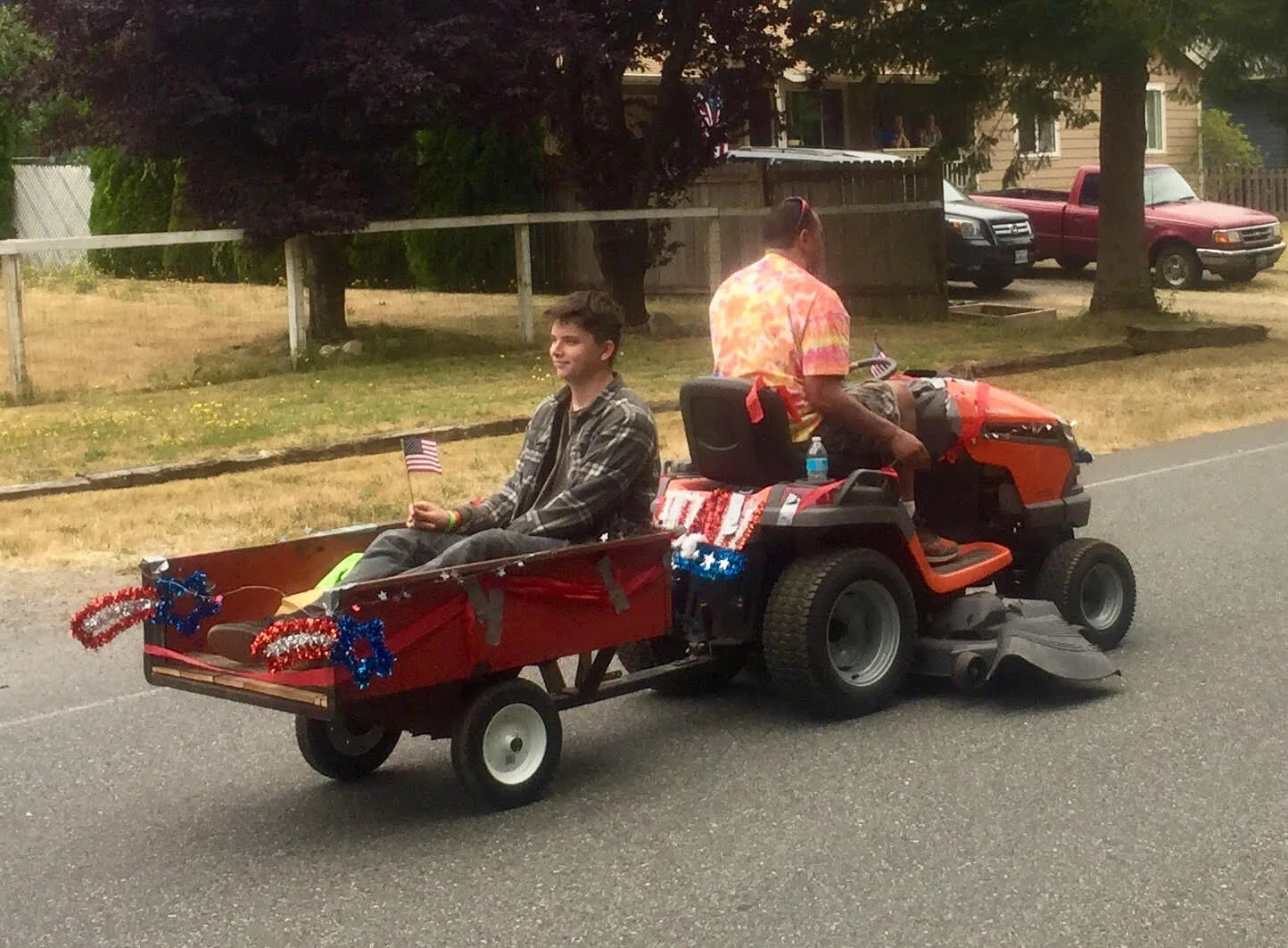 10AM: parade begins. A highlight was the large quantity of candy that participants threw out of car windows to the gathered children along the side walk, prompting the children to dash forward into the street and toward the moving cars in order to snag the best candy. Another highlight was the "float" entirely comprised of a riding lawnmower adorned with tinsel and driven by a hunched over gruff-looking fellow, and pulling a small wagon carrying a large man who waved unenthusiastically (no evident affiliation or other reason for their participation in the parade).